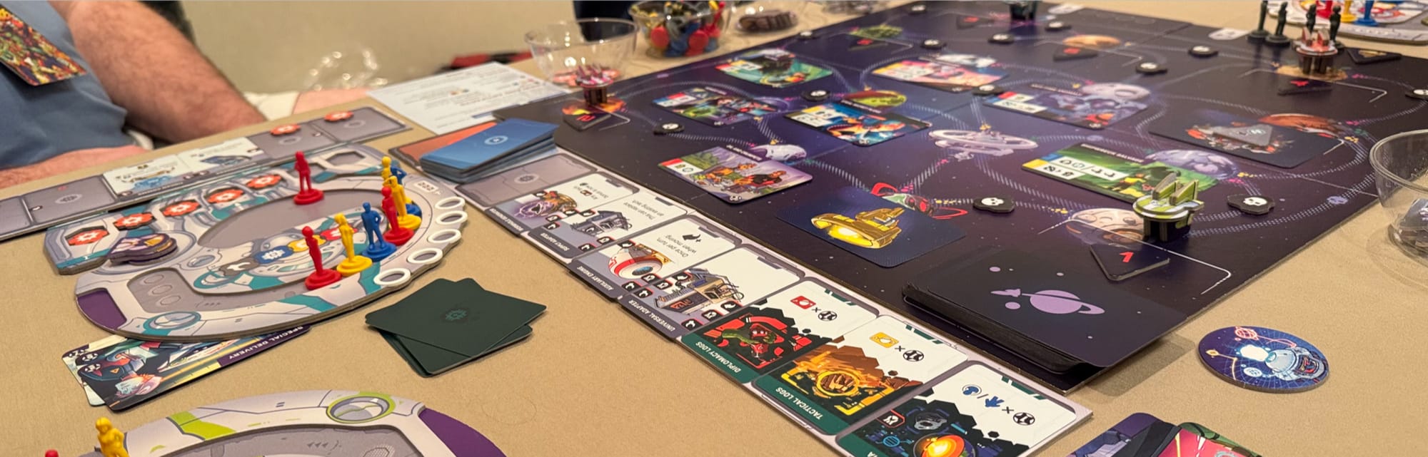 During our first get-together, we played Starship Captains, and we have kept up a tradition of playing it each time we've gathered. Heavily influenced by Star Trek about managing the crew of your ship and visiting planets in the galaxy and completing missions.