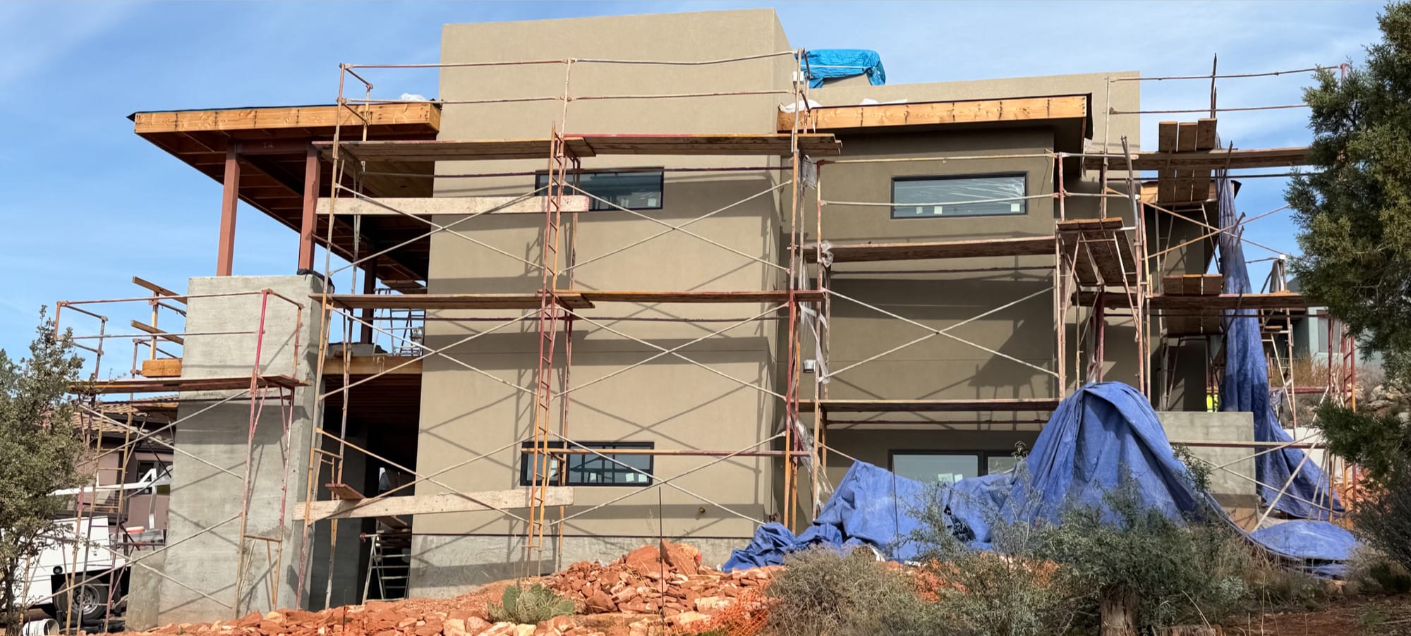 Things are coming along now. Finally, we got the outside stucco color on. I don't have a more recent photo with the scaffolding down, but here it is.